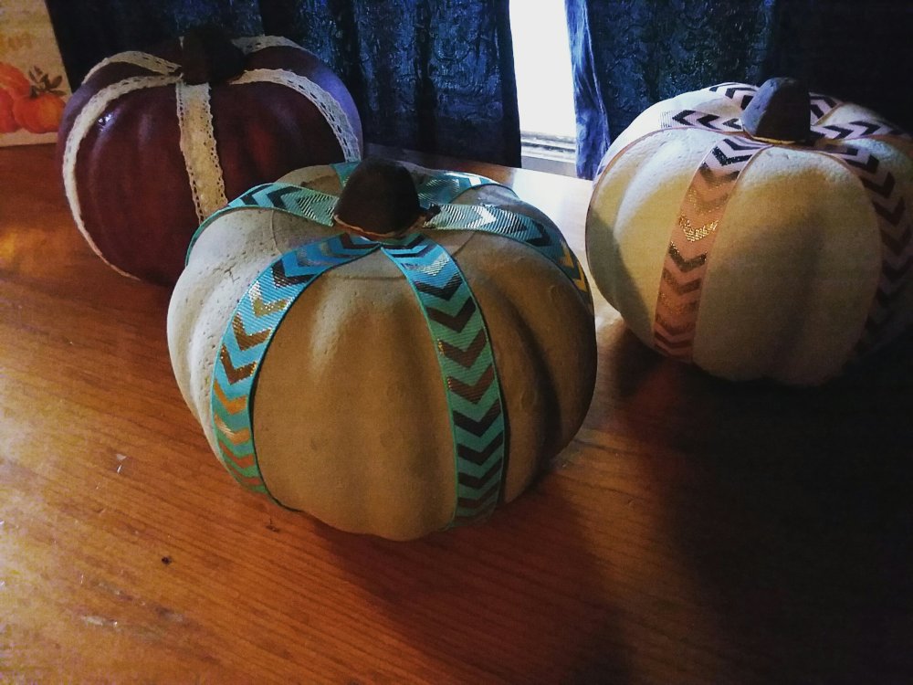 After sorting through everything on my table I decided to start painting thr pumpkins. They turned out super cute. All I used was Styrofoam pumpkins from the dollar store and acrylic paints for each pumpkin. After they dried I used glue to stick on the ribbons. It added a very chic look to my fall pumpkins.